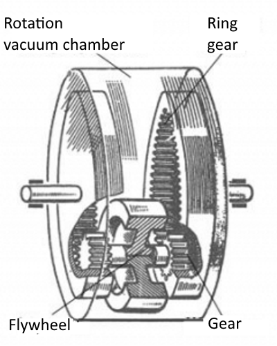 Super flywheels rotating in a vacuum with a frequency of hundreds of thousands of revolutions per minute accumulate mechanical energy efficiently. The issue is how to extract the rotation energy from the vacuum chamber. The idea is to place a flywheel inside another flywheel which is a rotating deaerated housing. Rotation is extracted by engagement of the flywheel gears with the ring gear of the housing.